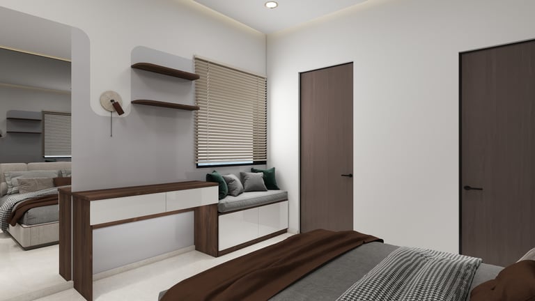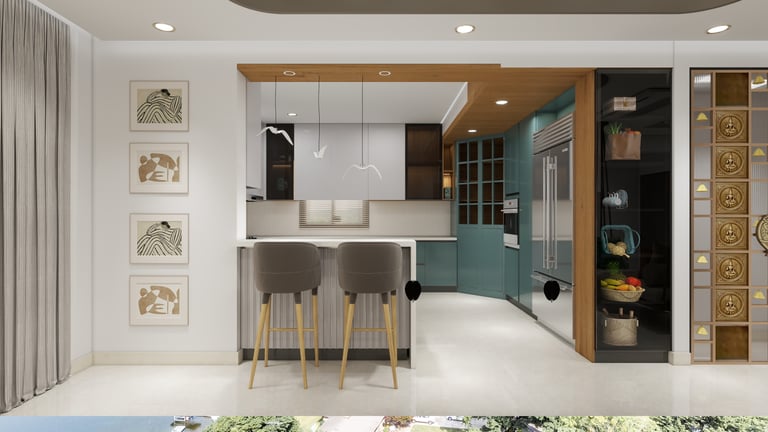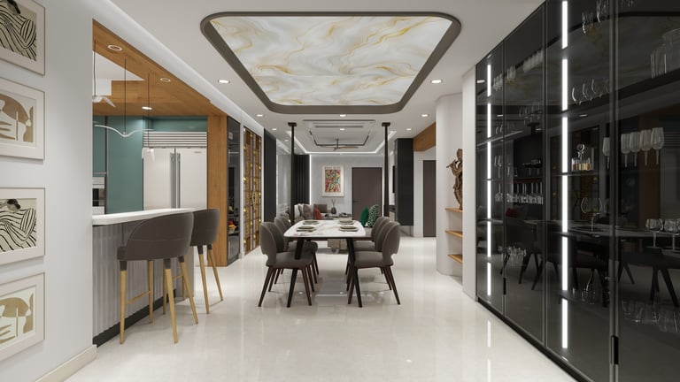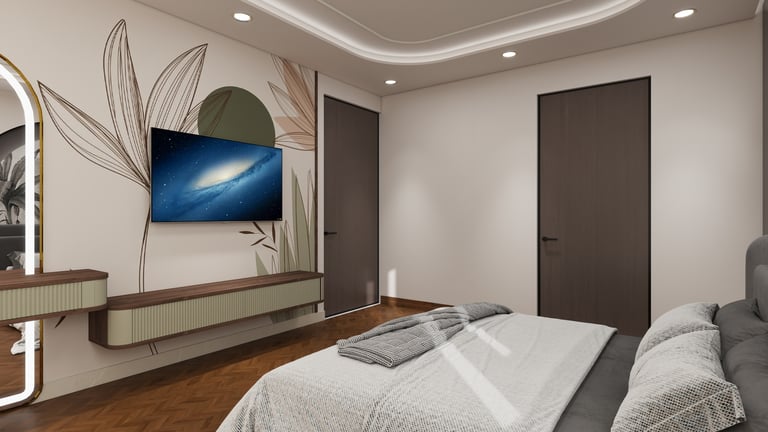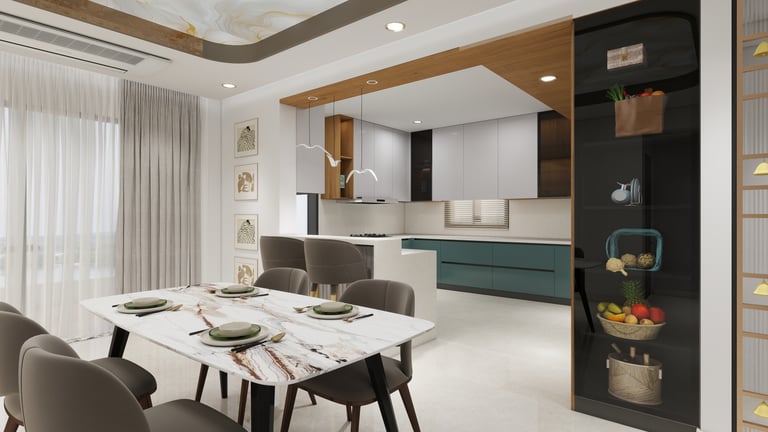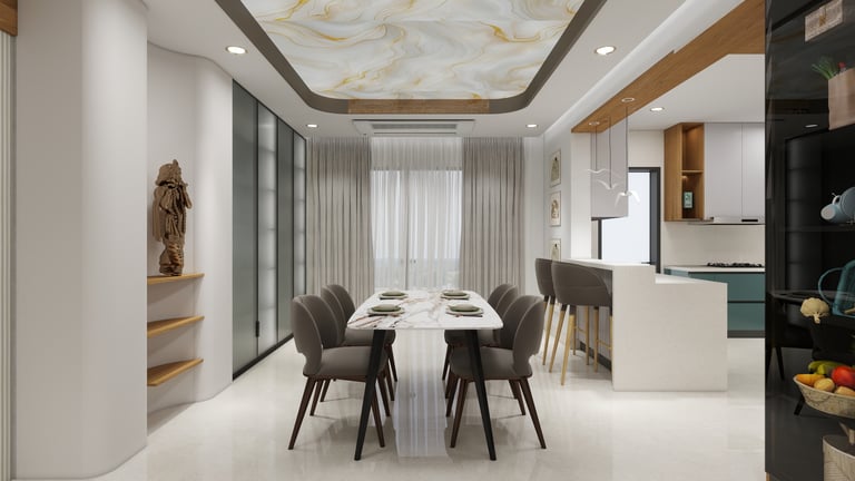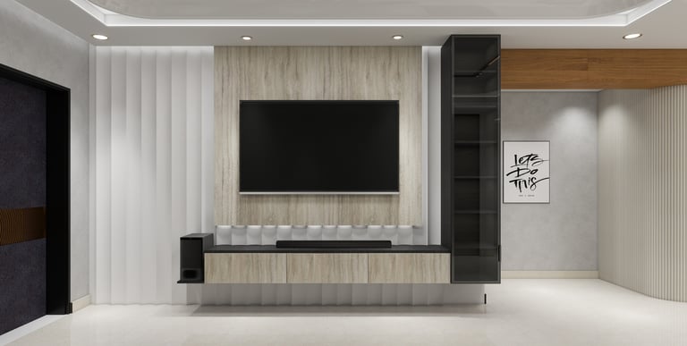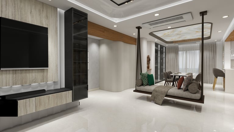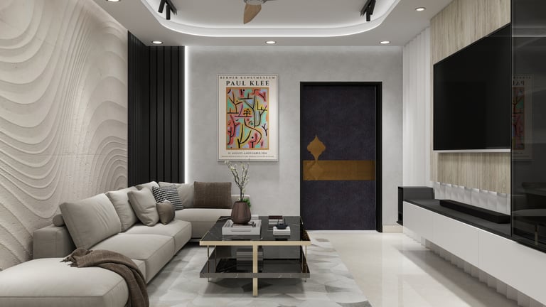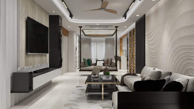 3BHK residential interior in Manikonda, Hyderabad, that blends contemporary aesthetics with functional living . The design philosophy centers on creating an open, airy, and luxurious feel through a strategic use of colors, materials, and bespoke elements.
